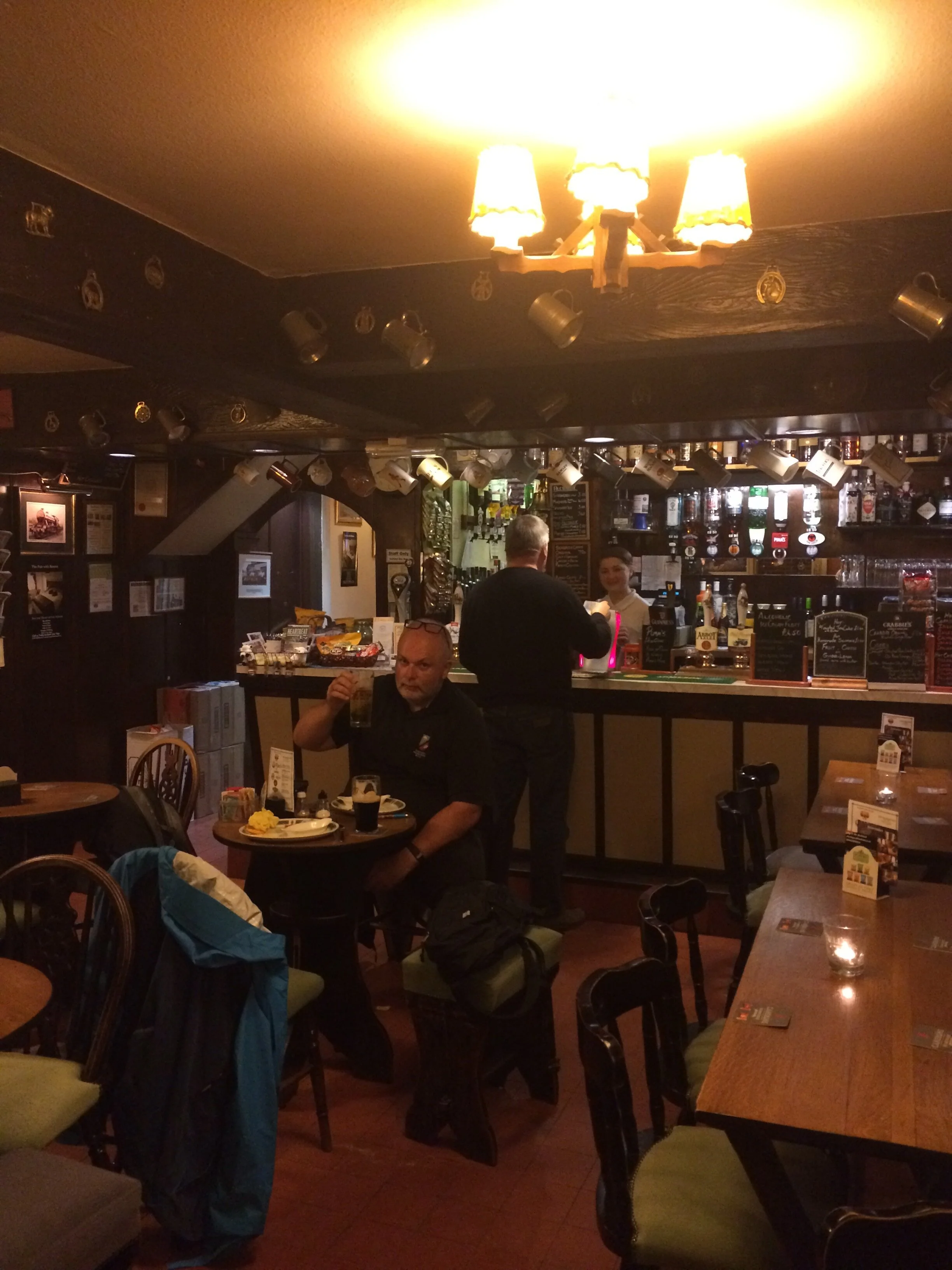 I ordered a modest lunch and stood at the bar facing out towards the village green. I was quite "taken" by this vista as it is now home to many gypsy caravans. The proprietor "Paddy" was a wonderful man who was extremely welcoming and friendly. Paddy is from Northern Ireland and at the point he found out Dale and I were off to NI later this month Paddy morphed into a human trip advisor. He described the many places and sights to visit upon our arrival which was hugely appreciated.Paddy gave me a cup of Tea on the house and we chatted about past and present in his home town of Belfast.