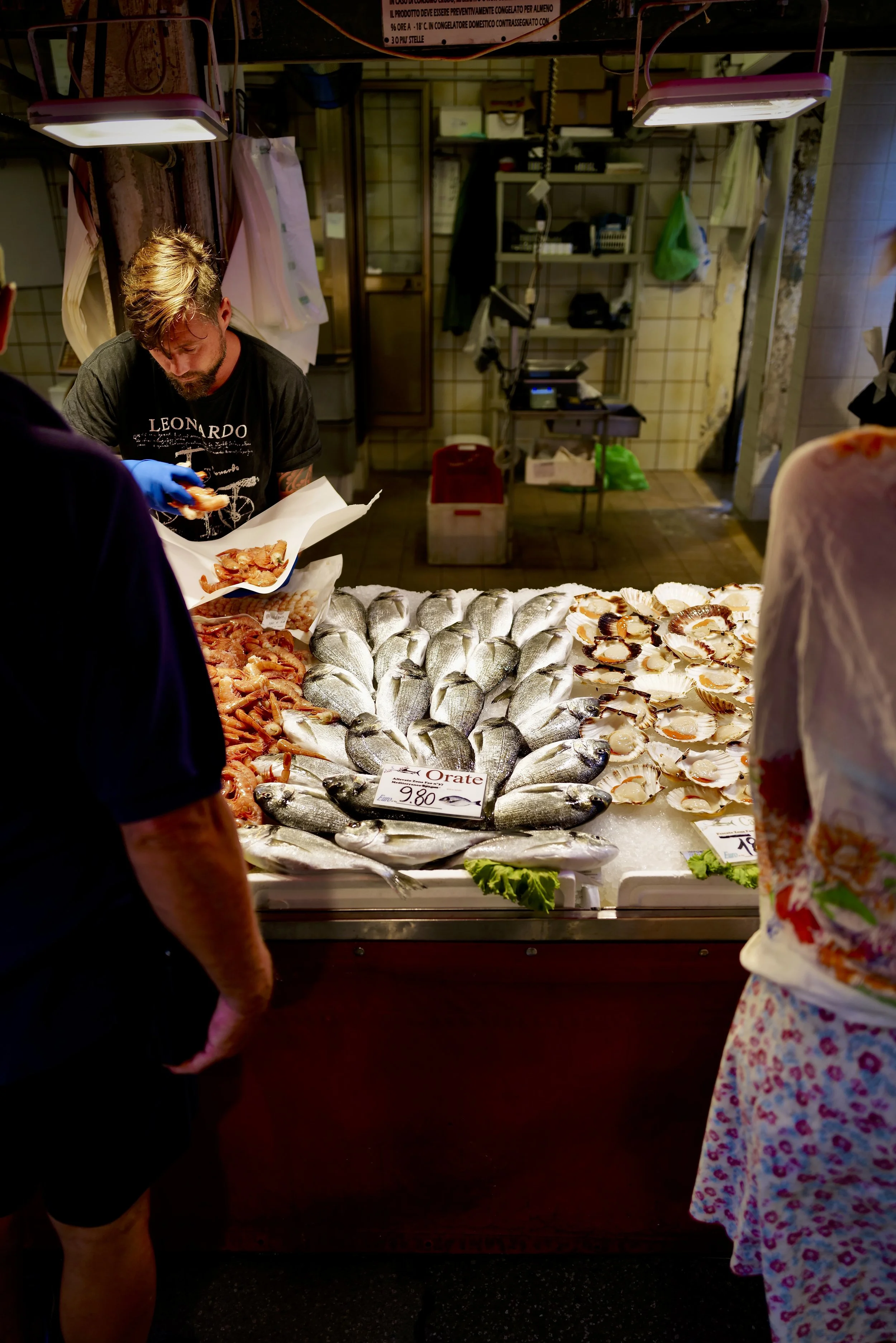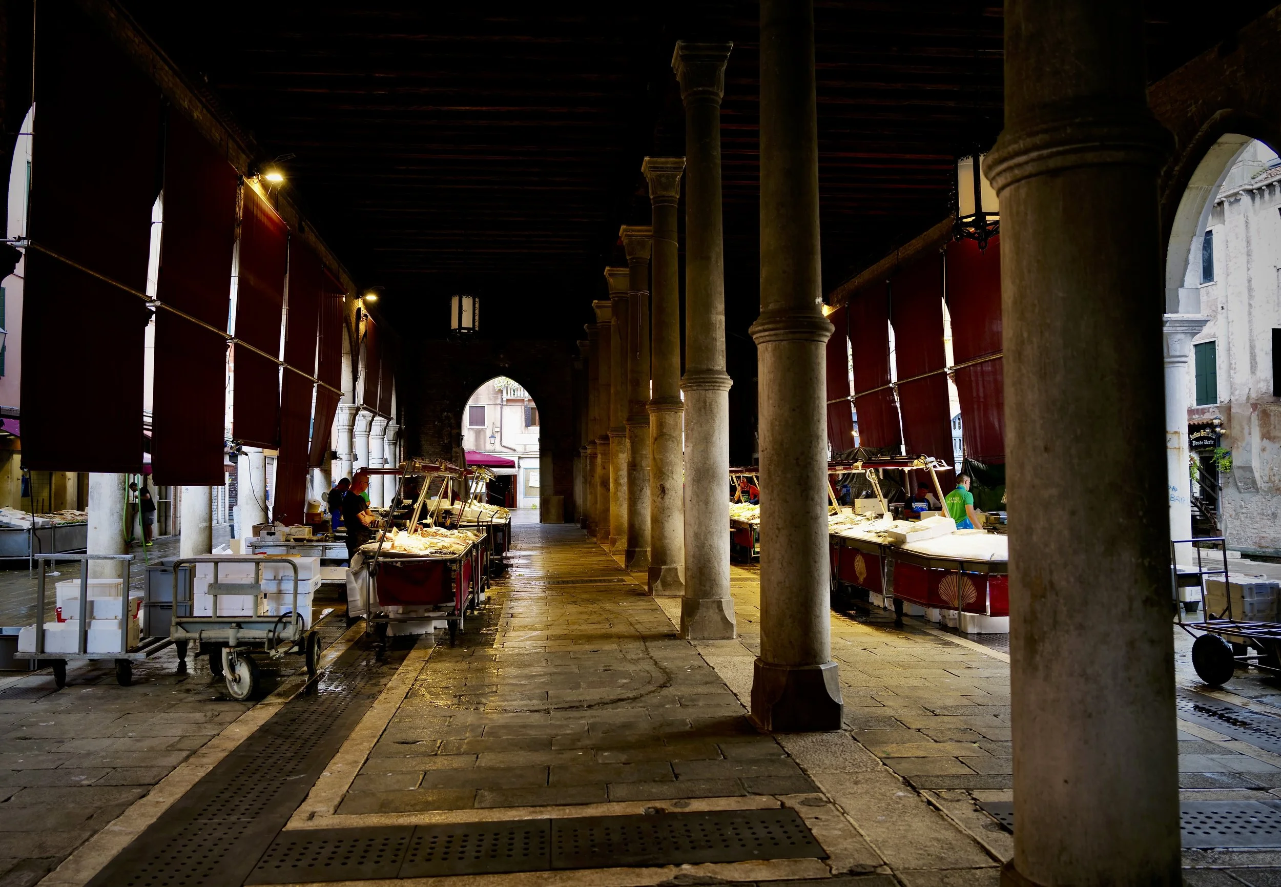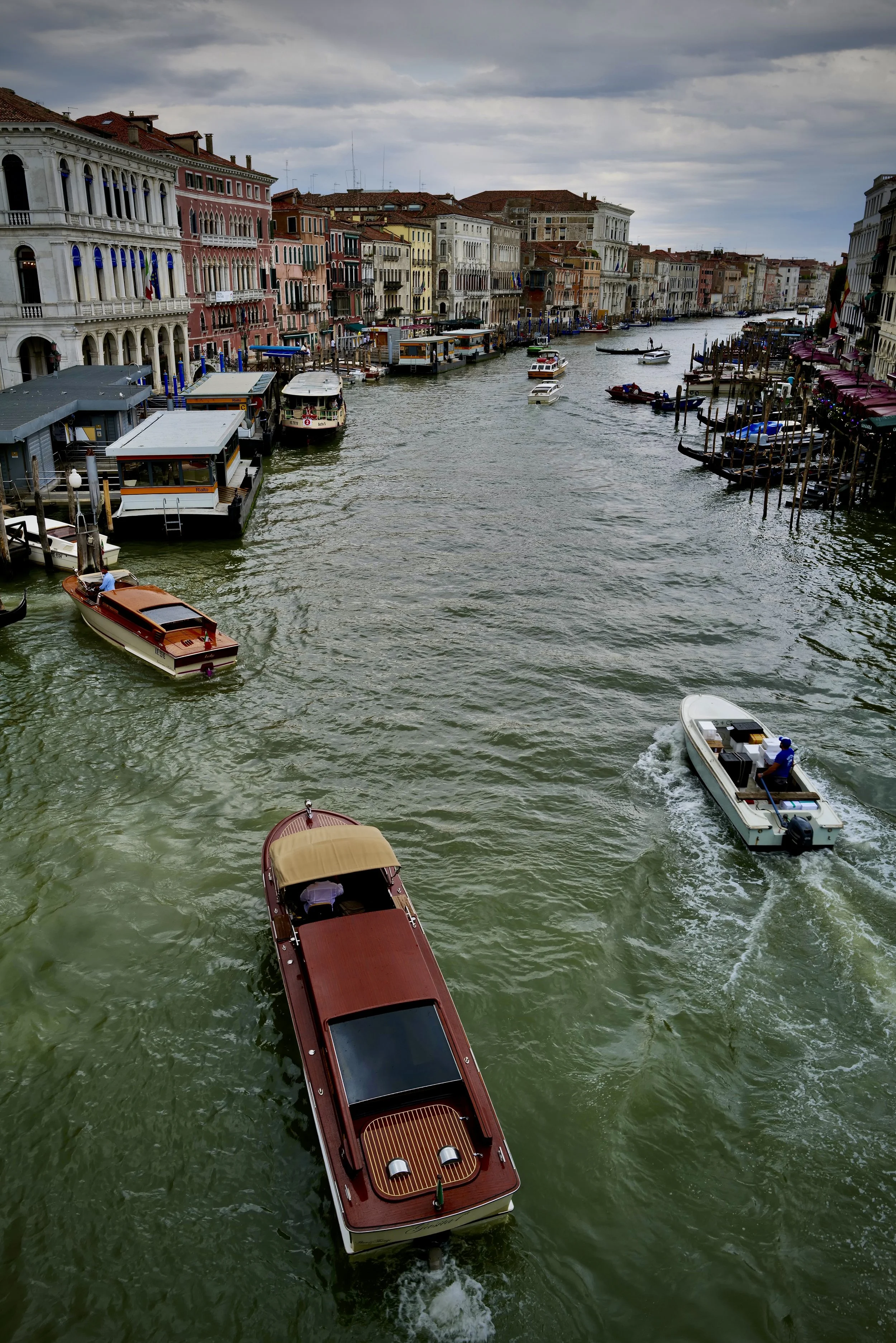 Six in the morning came quickly, and just a few minutes after waking, I was leaving the hotel. The dock is just a few steps away and I was soon aboard the Vaporetto and nearing "the big island." As we tied up alongside the hospital dock, I bolted for the back streets. The Rialto bridge was my first real stop, and after a few minutes on the top of the span, I moved on to the fish market. What an environment. What an electric feeling. I observed, photographed, and then moved back to the streets off the square. I could have stopped for a coffee, but I wanted to save all consumption of food and drink for Harry's.